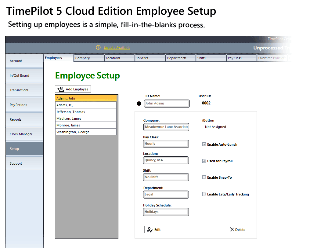 Which software version is right for you? If you want to keep your database on your own network, and you'll use a computer on that network to prepare your data for payroll, the On-Premise Edition is probably the right choice. If you have employees at remote locations, or who might move from place to place, and/or you want to work with the data collected anywhere there's an internet connection, go with the Cloud Edition. Not sure? We'll be happy to make a recommendation. Contact our sales department at sales@timepilot.com or 630-879-6400.