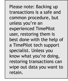 The first group (the green buttons) involves your Current Transactions—clock-ins and clock-outs that have not yet been extracted into a pay period. You can back them up to a USB drive, another hard drive, CD or DVD. You can also "restore" your Current Transactions. This means taking a backed-up copy of Current Transactions using them to replace the ones that are in the TimePilot database.