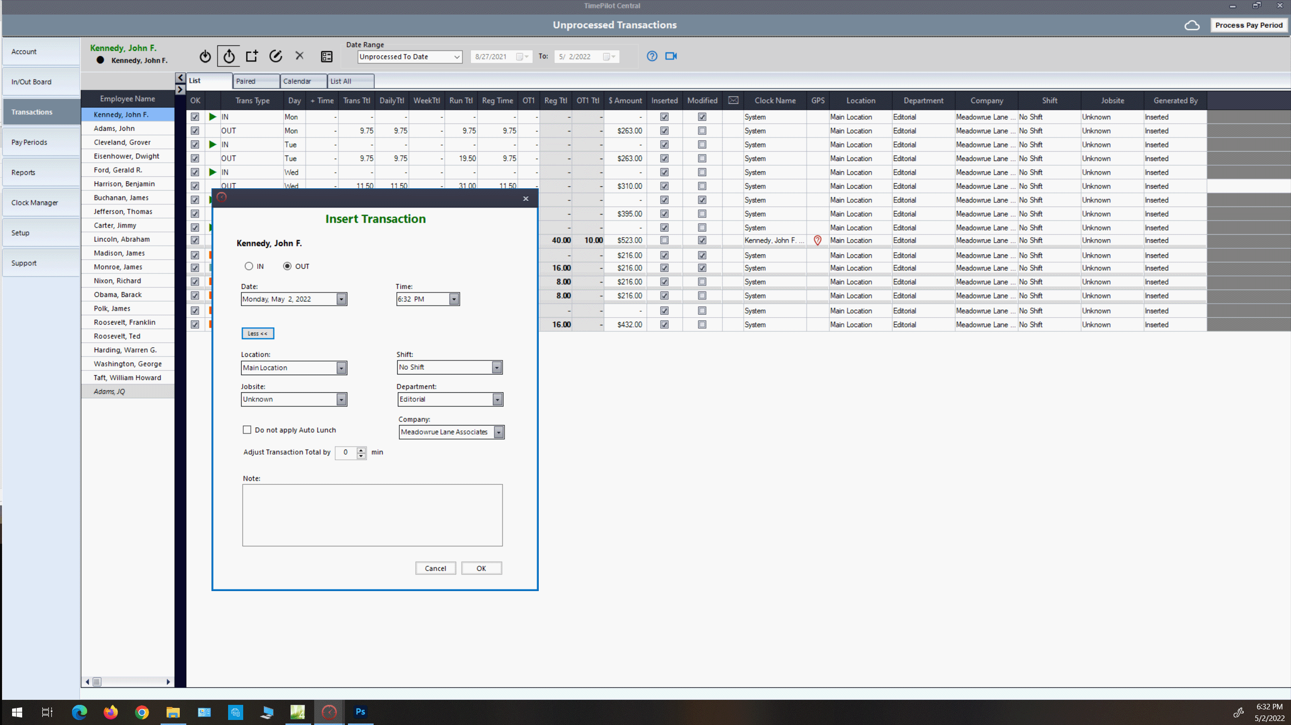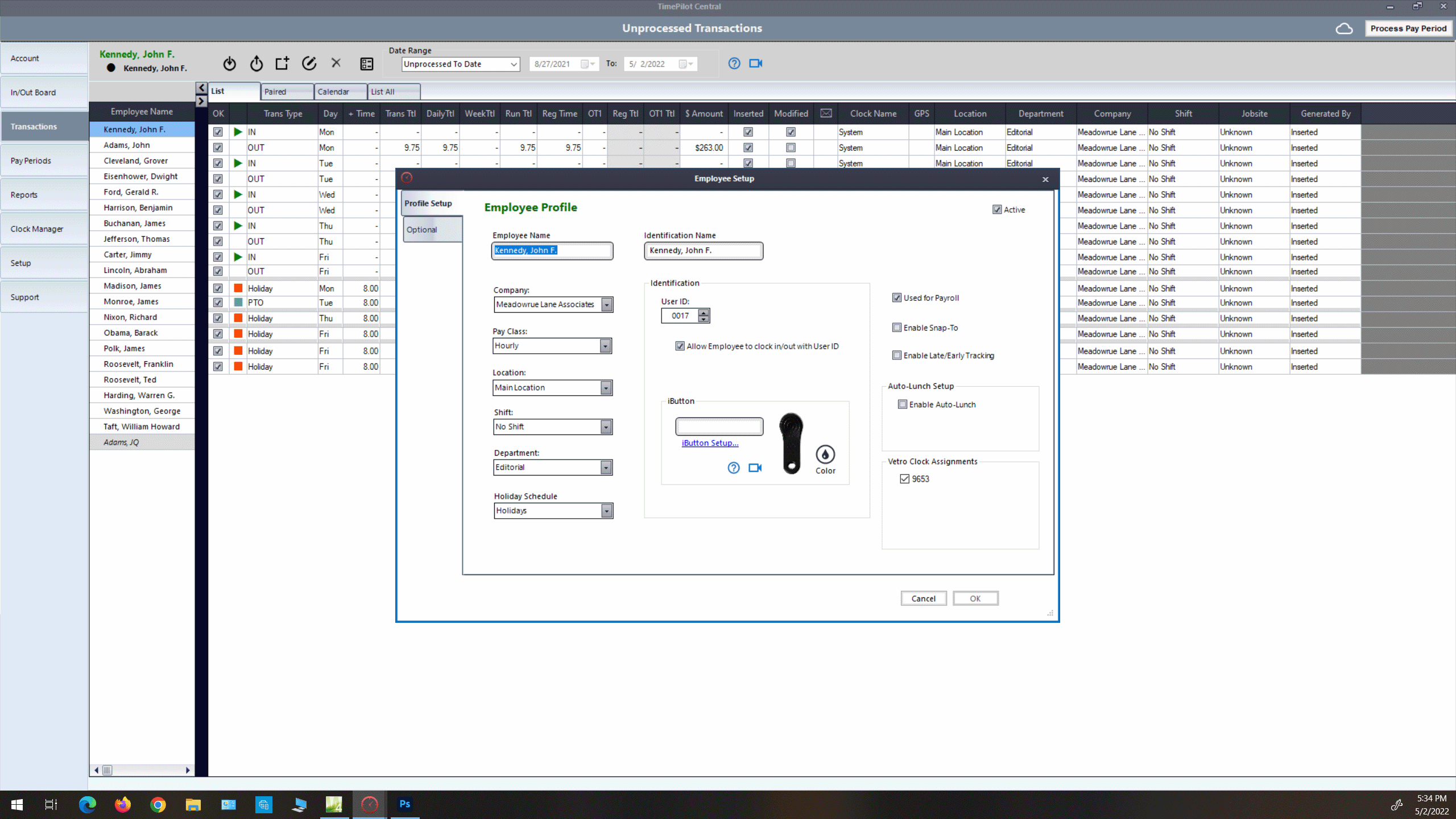 If you're using iButtons, you're instantly clocked in or out; if you're using a four-digit ID number to clock in or out, just enter the number and touch the "IN" or OUT" button.