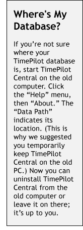 If your database is on your old computer and you want to move it to the new one, before you start the installation, copy the folder on the old computer that contains the TimePilot data to a USB drive and paste it onto the new PC’s hard drive. See the box at right to learn where to find the database folder.