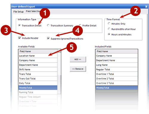That’s it for the “File Setup” screen. Now click the “Field Selection” tab at the top of the box. This is where you tell TimePilot exactly the data you want to export.